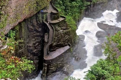 Le Canyon Staircase en Equateur est situé près de la célèbre cascade Pailon del Diablo sur la rivière Pastaza. C’est une cascade assez grande et l’une des principales destinations touristiques de l’Équateur. L’escalier lui-même est l’une des plus grandes attractions de l’endroit. Il serpente à travers le feuillage avec des courbes naturelles en synchronisation avec la cascade, et est l’un des escaliers les plus célèbres au monde.