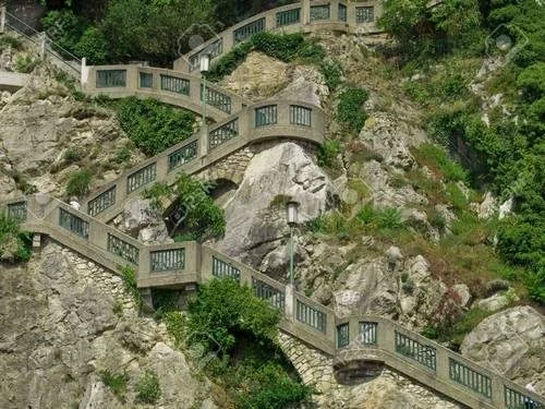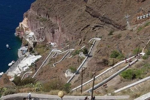 L’escalier de Santorin en Grèce est l’un des escaliers les plus célèbres au monde. Il a été construit en 1715 comme un escalier rugueux dans le flanc de la montagne, par les habitants de l’île pour marcher jusqu’au sommet. Il a été amélioré par la suite et utilisé pour le transport de marchandises et de passagers, principalement à dos d’âne. Bien qu’il y ait un téléphérique, l’âne monte l’escalier en zigzag avec 657 marches est toujours amusant et populaire.