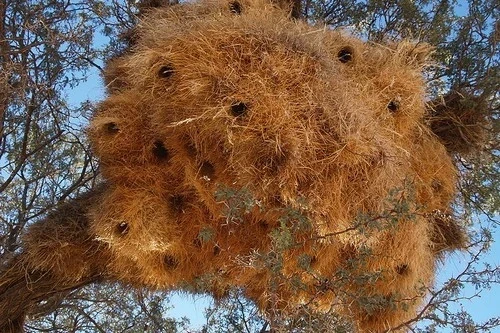 Cet oiseau se trouve en Afrique du Sud, ainsi qu’en Namibie et au Botswana. Ils construisent des nids communs permanents sur de grands arbres ou d’autres objets définis comme des poteaux téléphoniques avec des bâtons et de l’herbe. Les nids sont les plus grands intégrés par n’importe quel oiseau et sont capables d’abriter plusieurs générations chacune d’une centaine de paires d’oiseaux. Il y a de nombreuses pièces séparées. Les chambres centrales peuvent retenir la chaleur et sont destinées au repos nocturne, tandis que les chambres extérieures sont destinées à l’ombre diurne, car la température maintenue peut être d’environ 7-8°C, alors qu’il fait environ 16- 33°C à l’extérieur. Ces sky-condominiums ressemblent à des meules de foin,