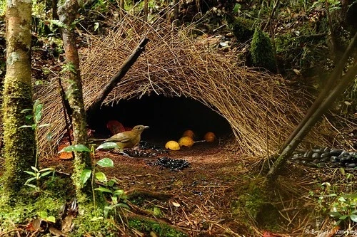 Le bowerbird vit dans la péninsule de Vogelkop en Indonésie. À l’aide d’herbe et de bâtons, les oiseaux mâles construisent des tonnelles au sol, qui ressemblent à de petites huttes pygmées. Ces tonnelles sont leur façon d’attirer des compagnes. Construire les tonnelles n’est pas tout : ils conçoivent également les intérieurs en disposant artistiquement baies, fleurs, coléoptères et autres objets ornementaux accrocheurs, car chaque oiseau fait de son mieux pour surpasser son voisin. Les oiseaux femelles visitent les nids et s’ils aiment ce qu’ils voient, ils s’accouplent avec l’hôte. Les oiseaux femelles le font probablement pour vérifier la capacité et le sens des responsabilités du mâle, car ces tonnelles ne jouent aucun rôle dans la nidification et l’élevage des jeunes.