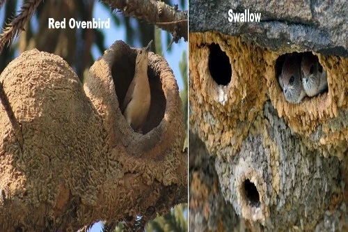 Le hornero roux ou l’oiseau de four rouge use de la boue ou de la bouse comme matériau principal pour construire des bols en terre, construits au-dessus de hautes branches d’arbres, de poteaux, de poteaux, etc., où ceux -ci sont cuits au soleil, délivrés un abri durci où les oiseaux pondent des œufs. Les nids sont orientés à l’opposé des vents dominants. Ainsi, ceux-ci sont parfaits pour l’incubation des œufs et constituent une maison pour les oisillons et leurs parents par tous les temps. De nombreuses espèces d’hirondelles construisent également des nids de boue. Les nids d’hirondelle peuvent également être fabriqués à partir de la salive des oiseaux. Ces nids, intégrés en colonies, sont interprétés comme de la friandise par certaines personnes. On pense que l’