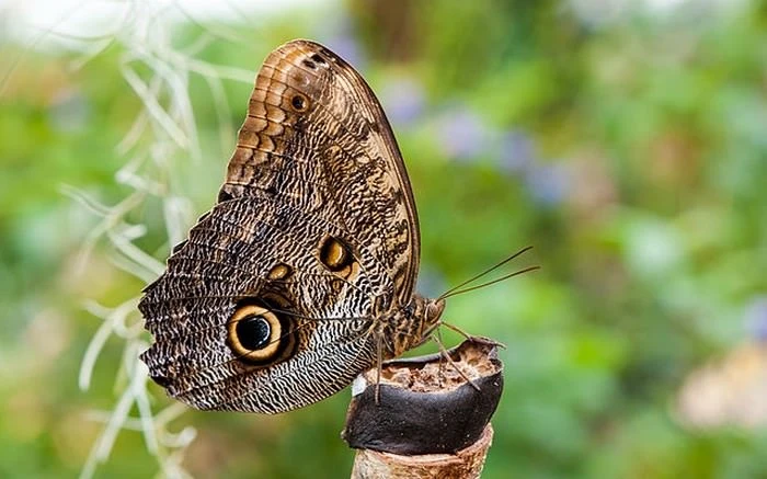 Les papillons hiboux géants sont surtout connus pour les taches oculaires présentes sur leurs ailes qui ressemblent à leurs propres yeux. Ils appartiennent à la famille des papillons hiboux et sont originaires d’Amérique centrale et du Sud. Ces grands papillons ont une envergure comprennent entre 13 et 16 cm. Les énormes motifs en forme d’œil sur leurs ailes ressemblent aux yeux de nombreux prédateurs. Il aide ces papillons à échapper facilement aux prédateurs comme les grenouilles ou les lézards et menace également de nombreux petits animaux. Le dessus de l’aile du papillon géant de la forêt hibou est brun jaunâtre avec des bordures violettes. Ces papillons se nourrissent principalement de fruits et ont une durée de vie de 125 à 150 jours.