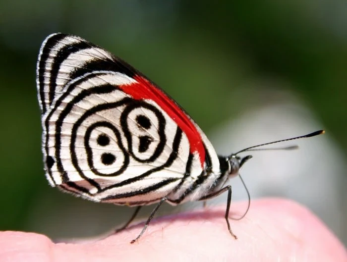 Ce magnifique papillon est originaire d’Amérique centrale et du Sud. Les rayures blanches et noires sur leurs ailes dessinent le nombre ’88’ et c’est pourquoi on les appelle ainsi. Ce même nombre se retrouve également dans 12 espèces de papillons diaethria. Cependant, le motif et la coloration sont légèrement différents selon les espèces. La partie supérieure des ailes du papillon Eighty Eight est noire avec une bande verte et bleue sur les ailes antérieures. Le dessous des ailes présente des marques noires sur fond rouge et blanc. La luminosité et l’épaisseur du marquage noir diffèrent selon quatre-vingt-huit papillons.